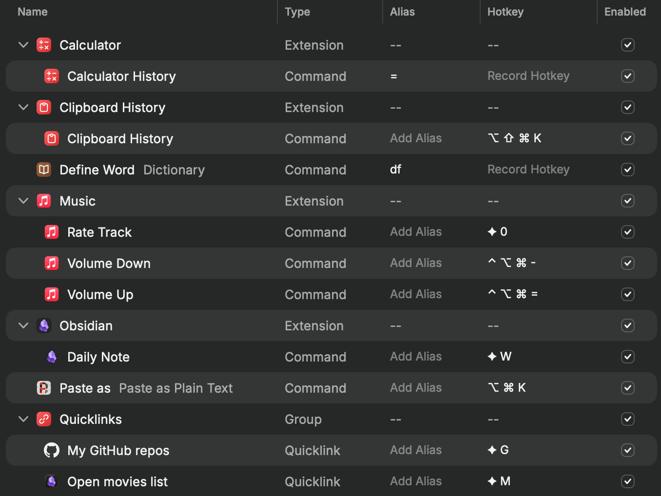 My extension settings (there’s no easy way to share these details other than screenshots 🤷♂️). The ◆ symbol here stands for ⌘⌥^⇧ (or mashing the whole corner of my keyboard).