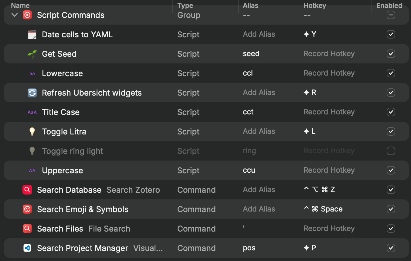 My custom Raycast scripts (neat things like getting a random.org seed, toggling a webcam light)